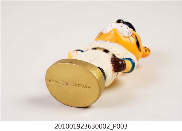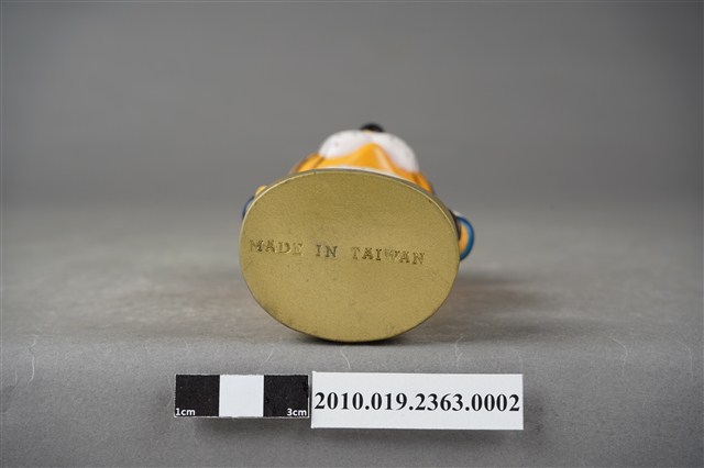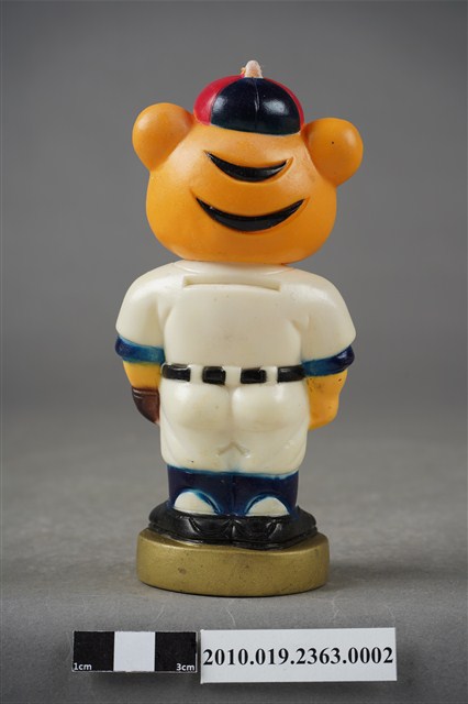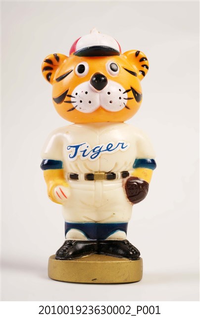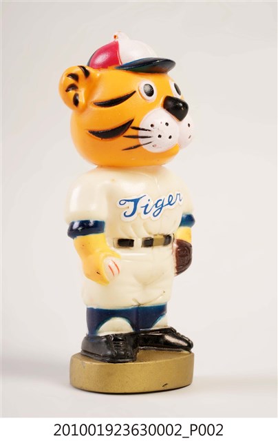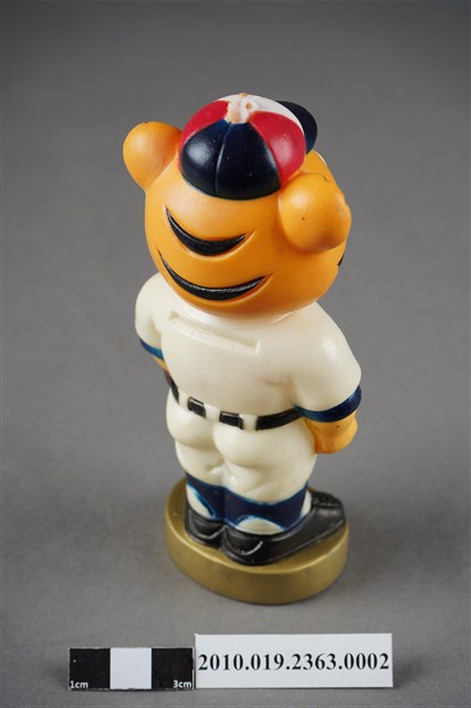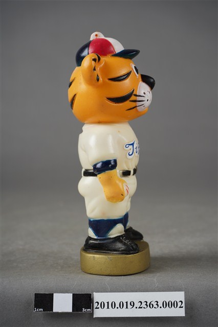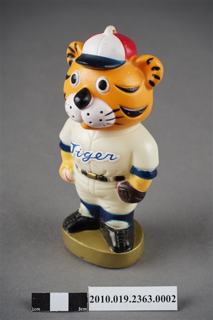 1.本物件為中華職棒三商虎隊吉祥物玩偶,為虎頭人身,頭戴棒球帽,身穿白色棒球服,棒球服上有藍色「Tiger」之字樣,右手握有棒球,左手戴有手套,腳穿黑色棒球鞋,呈立正姿勢。底座刻有「MADE IN TAIWAN」之字樣。