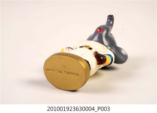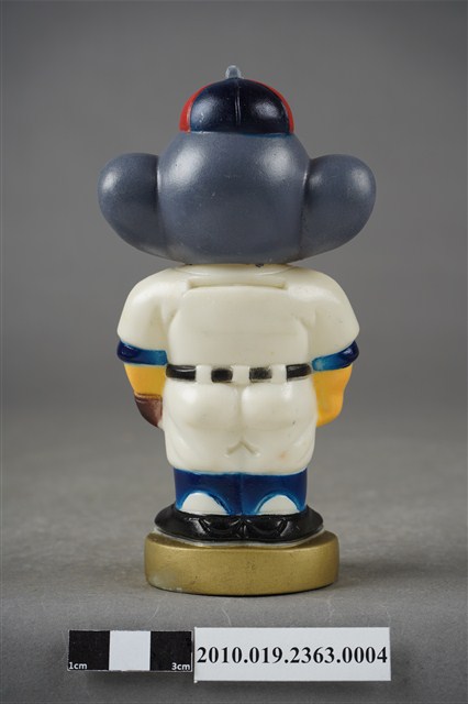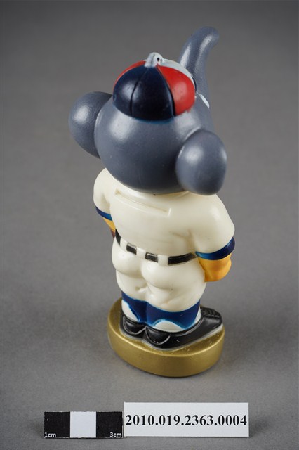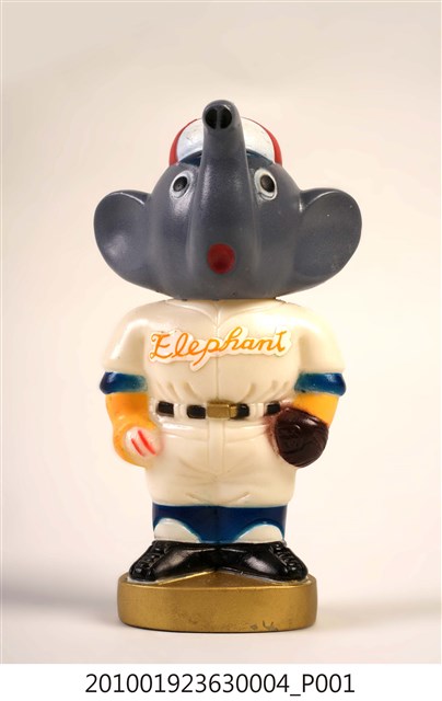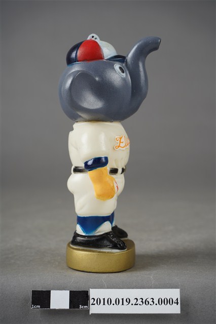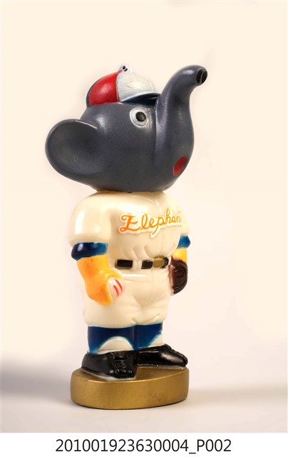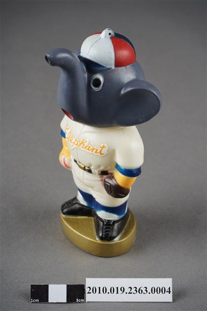 1.本物件為中華職棒兄弟象隊吉祥物玩偶,為象頭人身,頭戴棒球帽,身穿白色棒球服,棒球服上有黃色「Elephant」之字樣,右手握有棒球,左手戴有手套,腳穿黑色棒球鞋,呈立正姿勢。底座刻有「MADE IN TAIWAN」之字樣。
