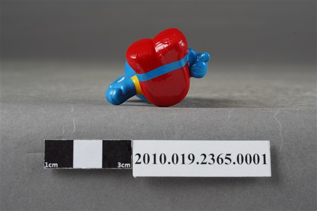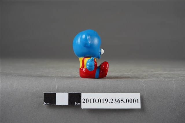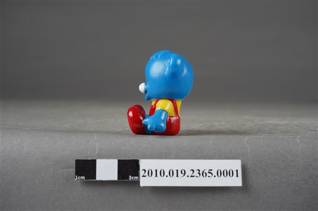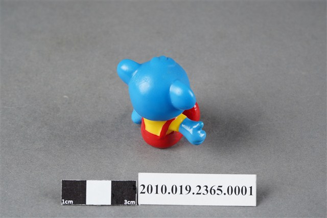 1.本物件為雀巢成長藍熊寶貝造型玩具,材質為塑膠,藍色小熊呈坐姿,身著黃衣紅色吊帶褲,右手大拇哥豎起。