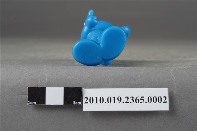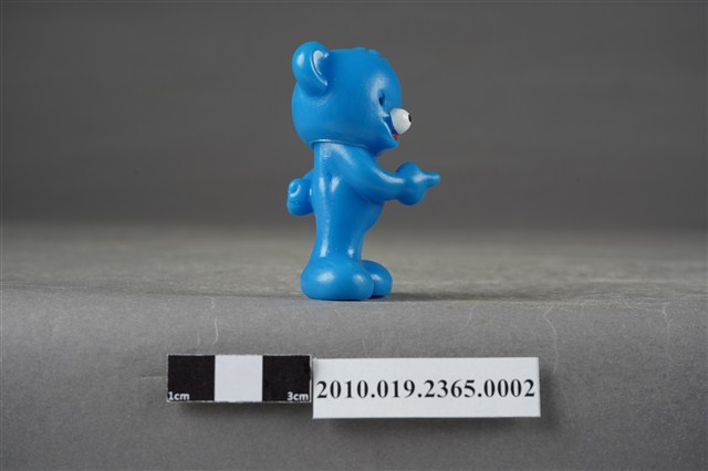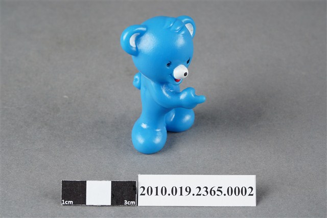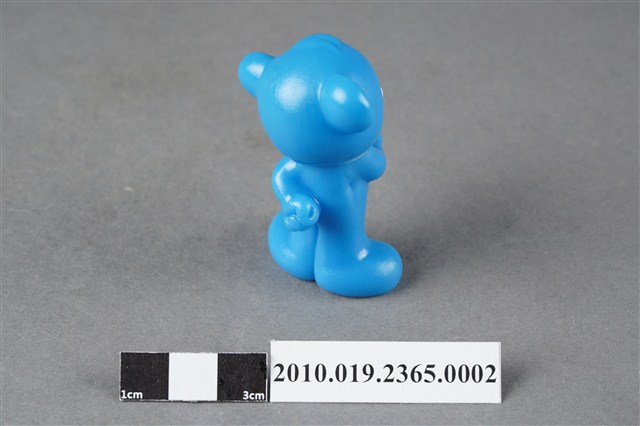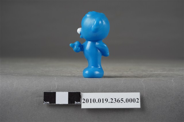 1.本物件為雀巢成長藍熊寶貝造型玩具,材質為塑膠,藍色小熊呈站姿,右手食指向前,左手握拳擺在後方。