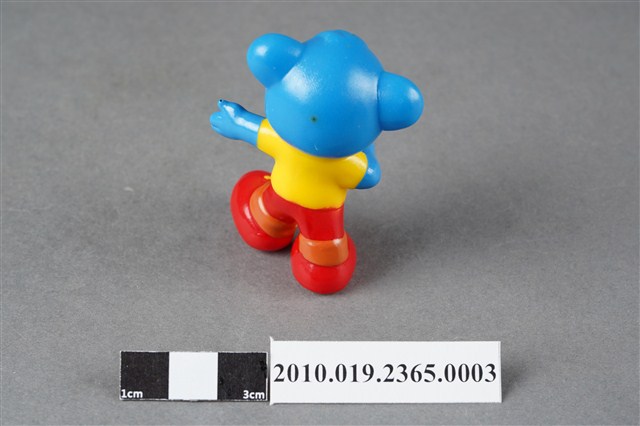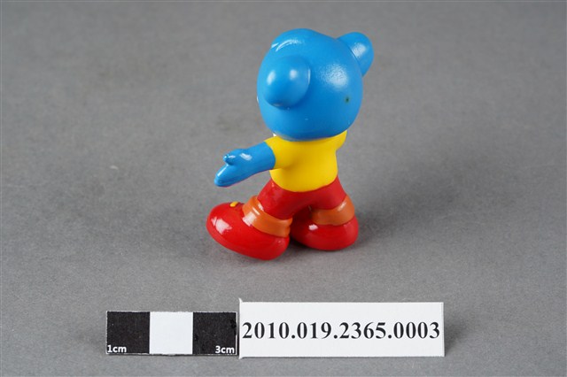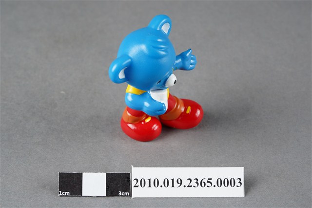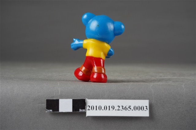 1.本物件為雀巢成長藍熊寶貝造型玩具,材質為塑膠,藍色小熊呈站姿,身著黃衣紅褲,腳穿紅鞋,右手拿有白色杯子,左手向外張開。