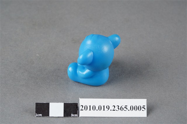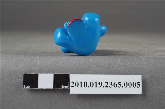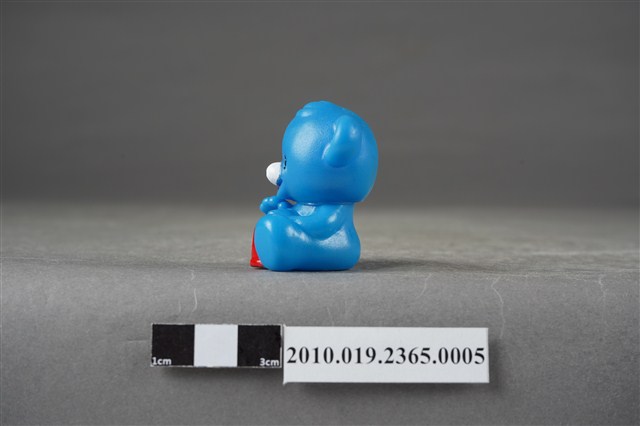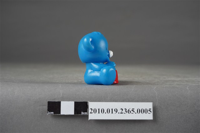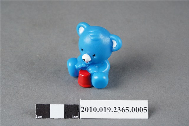 1.本物件為雀巢成長藍熊寶貝造型玩具,材質為塑膠,藍色小熊呈坐姿,雙腳向外張開,前方放有倒蓋紅色塑膠桶,雙手成敲打姿勢。