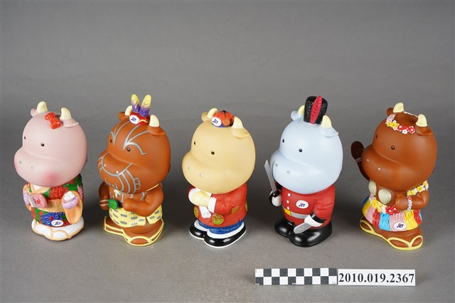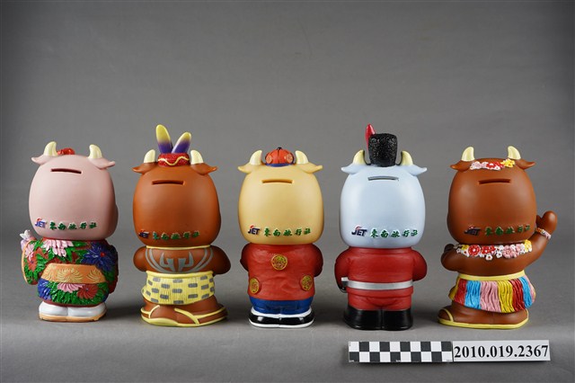 1.本物件為東南旅行社40週年紀念存錢筒,材質為塑膠,有左至右分別為日本版、澳洲版、中國版、歐洲版、美洲版。日本版身著和服,澳洲版身著原住民服飾,中國版身著唐裝,歐洲版身著英國衛兵服飾,美洲版身著草裙。