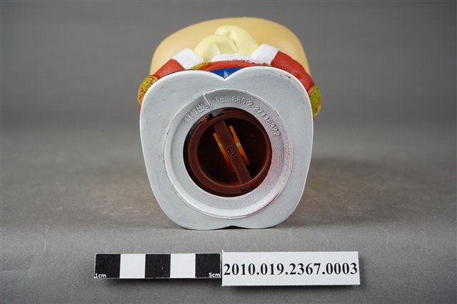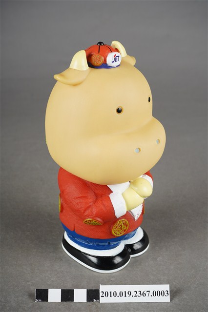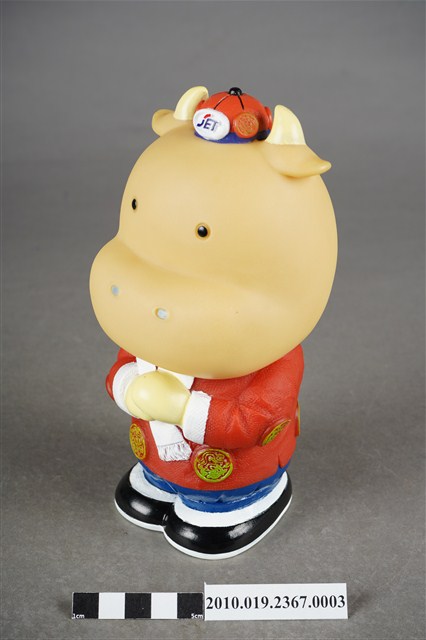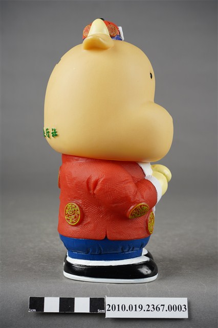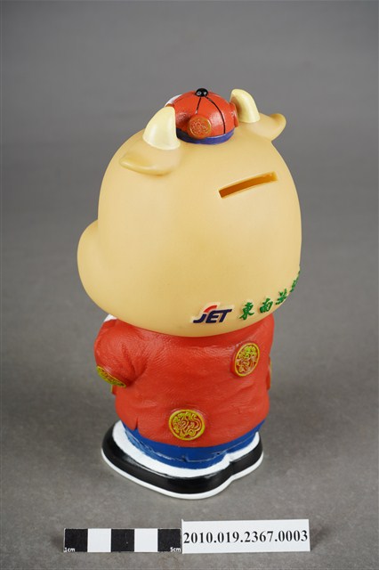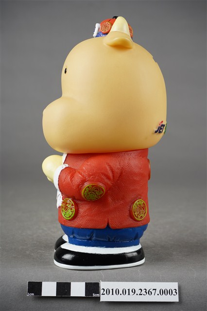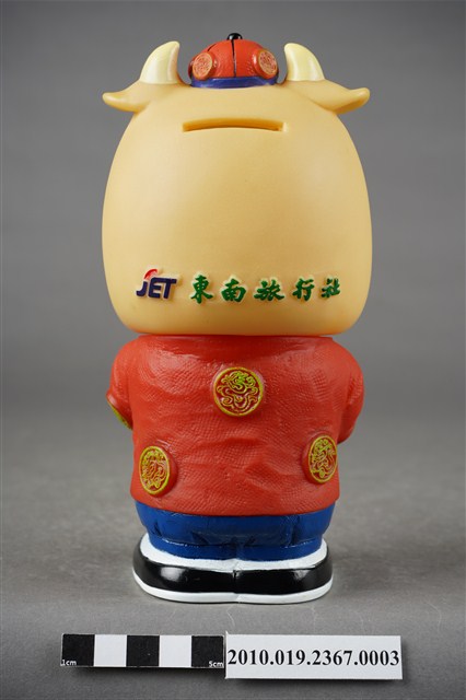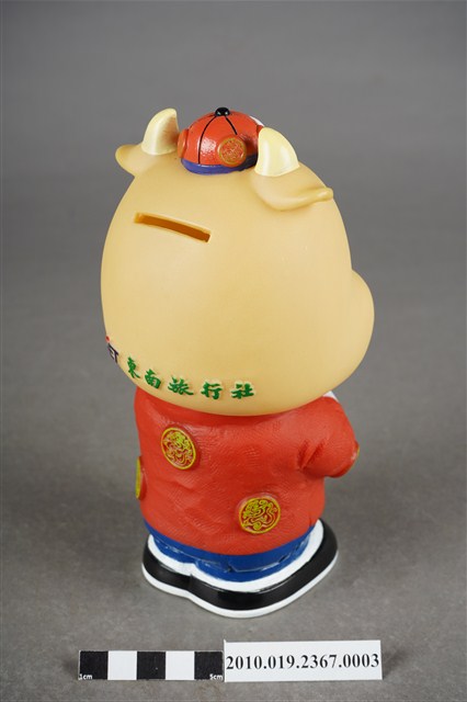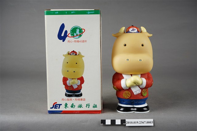 1.本物件為東南旅行社40週年紀念存錢筒中國版,材質為塑膠,樣式為黃色河馬,頭戴紅色小帽,身著紅色唐裝及藍色長褲,肩披白色圍巾,腳穿黑鞋,呈拱手姿勢。2.東南旅行社股份有限公司成立於民國50年,總公司位於臺北,服務內容涵蓋國內外團體旅遊、自由行、機票、飯店、交通、票券、國內外當地體驗、護照簽證。相關企業包括:皇家高粱酒、東南BEST遊學、東南遊覽汽車公司。