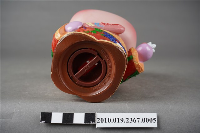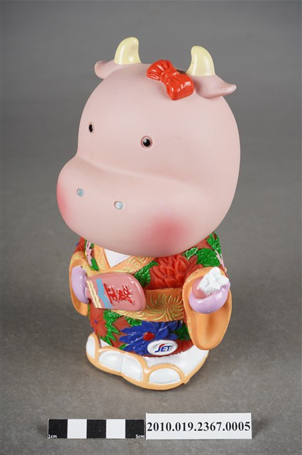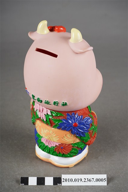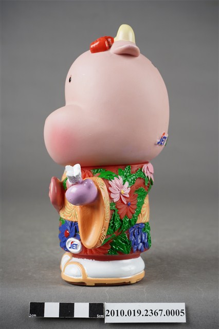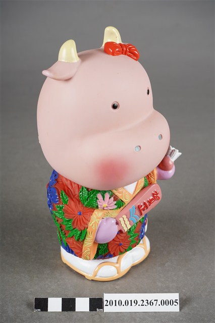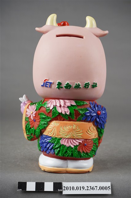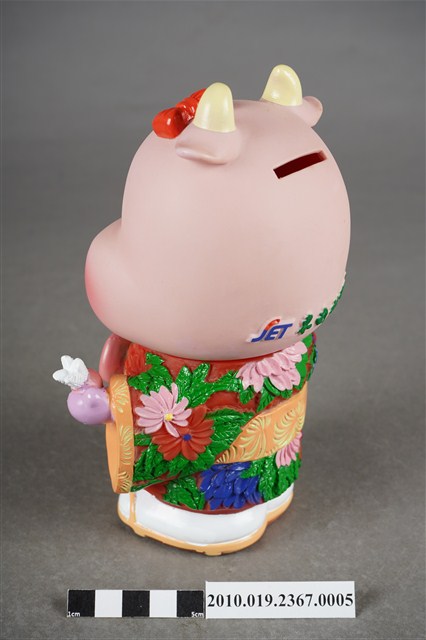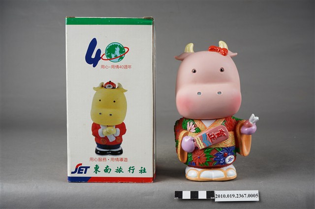 1.本物件為東南旅行社40週年紀念存錢筒日本版,材質為塑膠,樣式粉紅色河馬,身著和服,和服上印有紅花、藍花、粉花隻式樣,頭戴紅色蝴蝶結,腳穿木屐與二指襪,右手持有粉色扇子印有紅色「賀正」之字樣,左手拿有粉色毽子。2.東南旅行社股份有限公司成立於民國50年,總公司位於臺北,服務內容涵蓋國內外團體旅遊、自由行、機票、飯店、交通、票券、國內外當地體驗、護照簽證。相關企業包括:皇家高粱酒、東南BEST遊學、東南遊覽汽車公司。