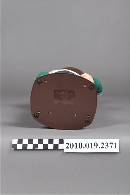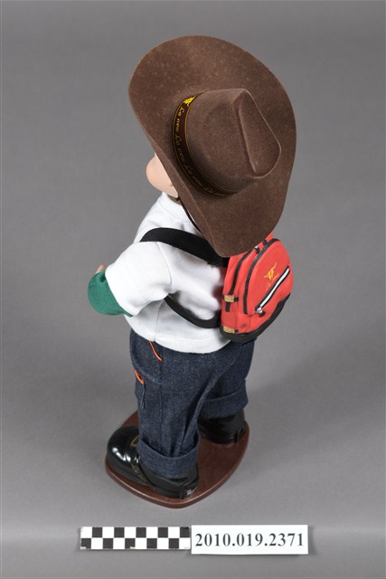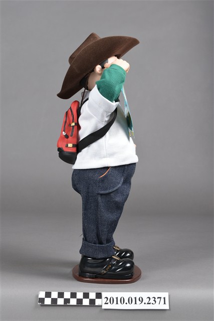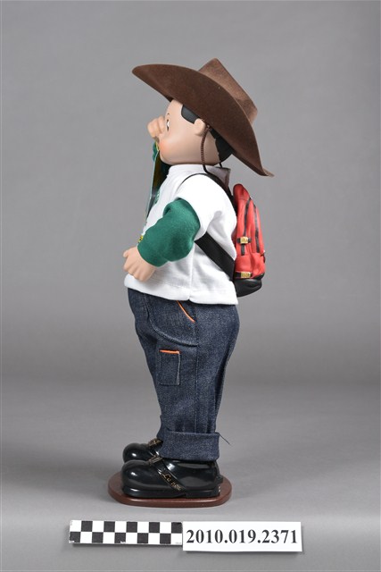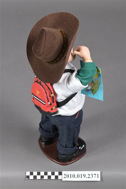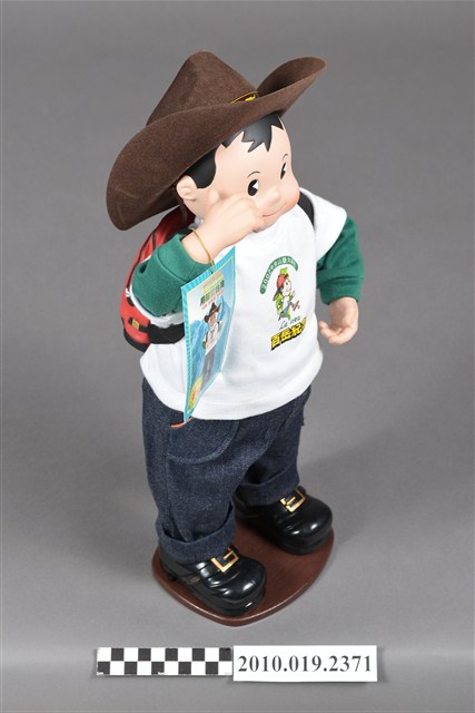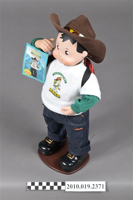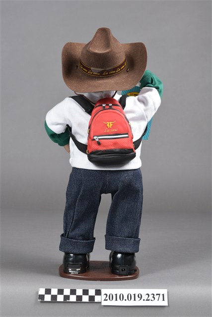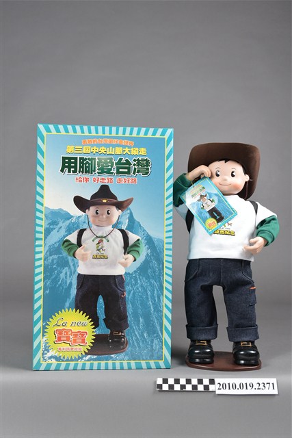 1.本物件為第三屆La new寶寶專利跳舞玩偶,高約40公分,寬約15公分。玩偶額前有瀏海,面露微笑,頰邊有腮紅。頭戴牛仔帽,帽圍有一標有La new標誌與字體的飾條,身著綠色長袖衣服,外𢟉白色短袖衣服,白衣胸前有「2002中央山脈大縱走」字樣、一男孩側身行走圖像及「La new」、「百岳紀念」字樣,右手腕繫有一紙牌,上有「勇敢的台灣囝仔走世界」、「第三屆中央山脈大縱走」、「用腳愛台灣」、「給你 好走路 走好路」等字樣,中間為玩偶與山脈的圖片,左下方有「La new 寶寶 專利跳舞娃娃」字樣,右側則有臺灣與美國之專利相關資訊。身後背有一橘色鑲黑邊之背包,上有La new圖樣。下半身著牛仔褲及黑色有扣皮鞋,皮鞋後方可見開關與音量調節鈕。玩偶立於一咖啡色底座,底座底部中央方框有La new標誌與「MADE IN CHINA」字樣。外包裝盒正面為玩偶舞動的圖像,最上方印「勇敢的台灣囝仔走世界 第三屆中央山脈大縱走」、「用腳愛台灣」、「給你 好走路 走好路」字樣,左下角有「La new寶寶 專利跳舞娃娃」。