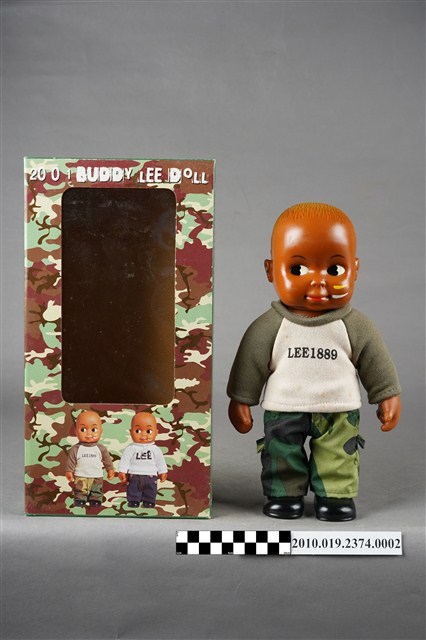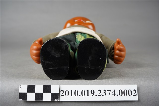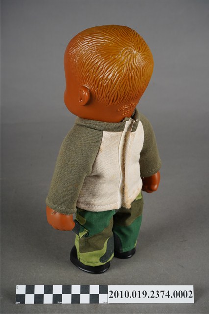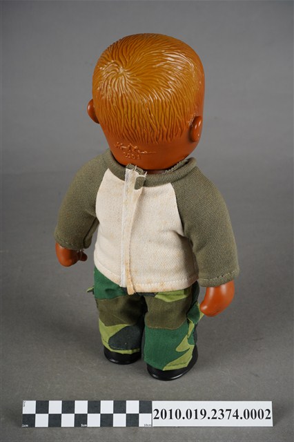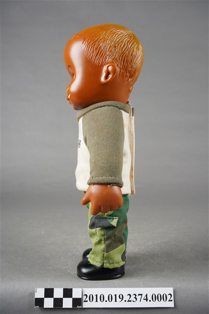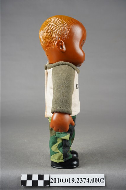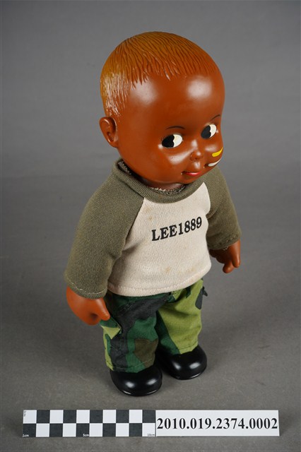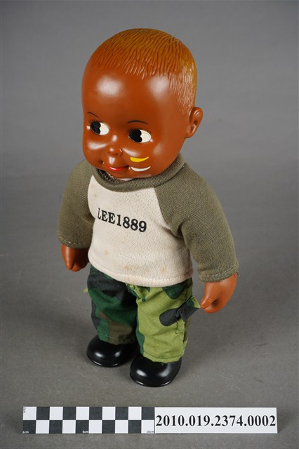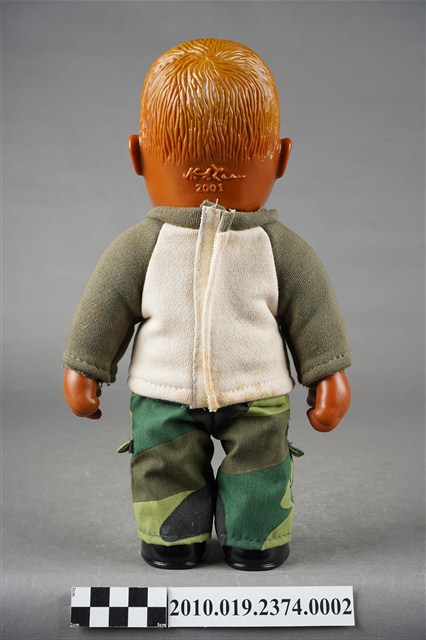 1.本物件為Lee牛仔褲迷彩長褲男孩玩偶,為塑膠材質玩偶,後腦處寫有一串文字與數字「2001」,細眉大眼,面部表情愉快,眼睛望向右方,左臉上並畫有黃色與白色線條,雙手自然落下,腳著黑色皮鞋,身著綠袖白衣,衣服上並寫有黑色「LEE 1889」字樣,下半身著綠色迷彩長褲,整個物件保存良好,顏色鮮明乾淨。