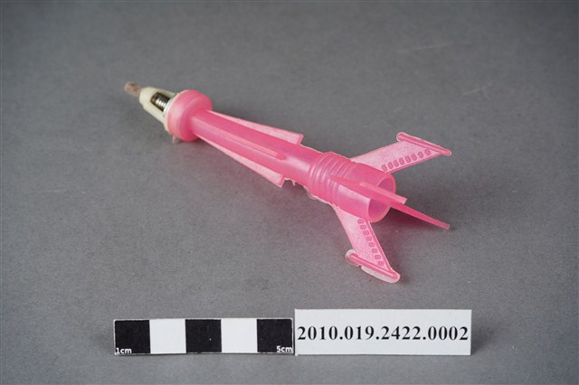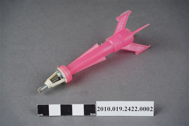 本物件為粉紅色玩具飛鏢,由鏢尖、鏢身、鏢桿和鏢尾等部分所構成,飛鏢的前端使用金屬製作,後端則為塑膠製,具有尾翼的細長鏢具投擲至靶子,物件本身保存尚可,沒有太多毀損。