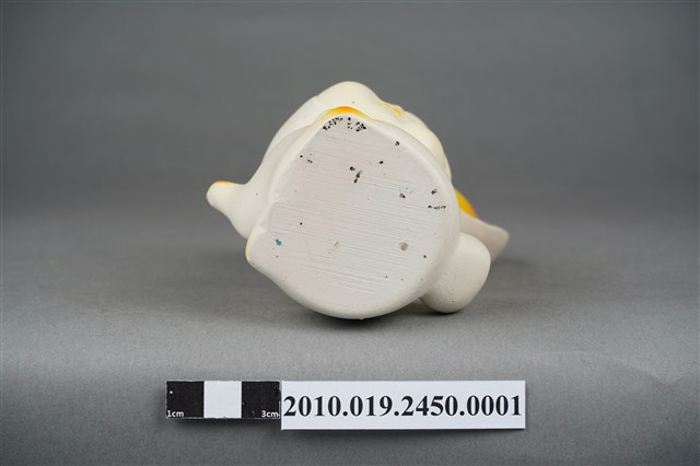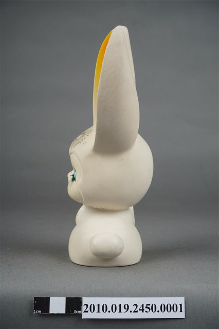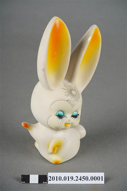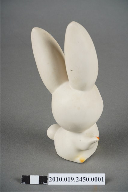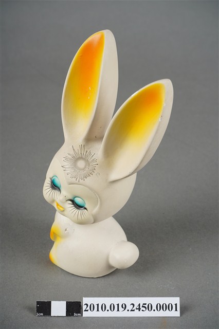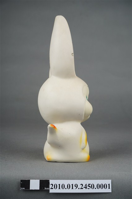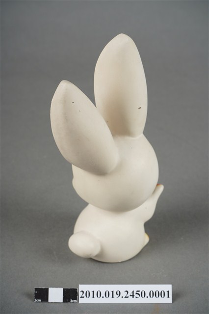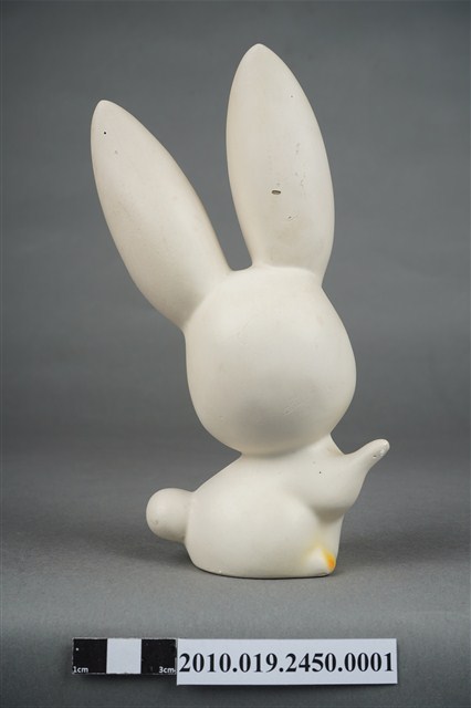 本物件為閉眼瓷器兔擺飾玩偶,為瓷器材質一體成型,玩偶頭上有黑色太陽印記,眼擦綠色眼影,睫毛長並閉眼微笑,採側身轉頭姿態,左手置於身旁,右手向上舉起,以站姿呈現,耳朵、手掌與腳掌處有橘色點綴,整個物件僅在左肩有些許毀損。