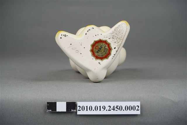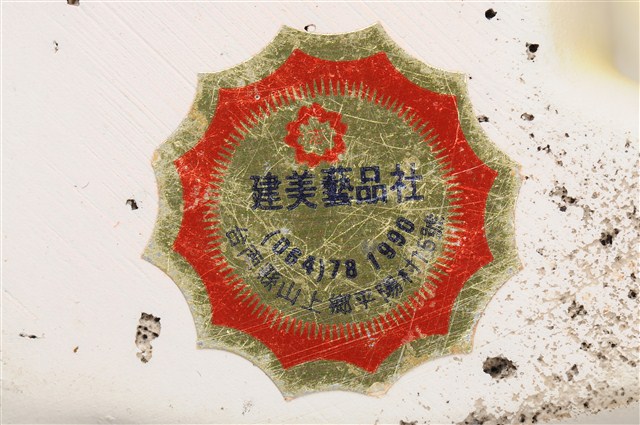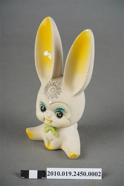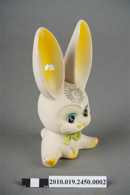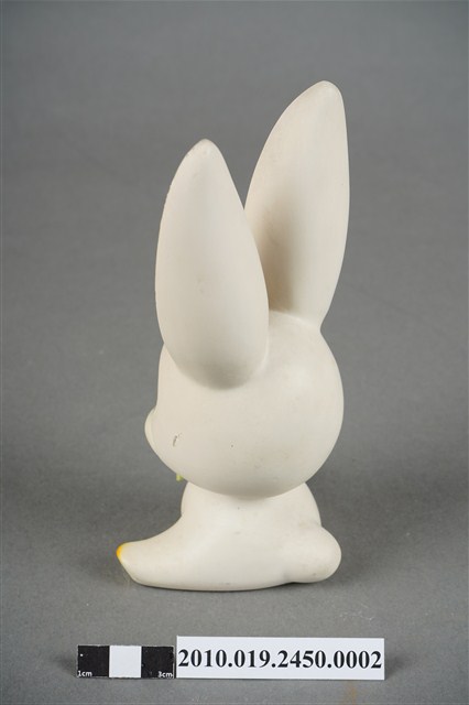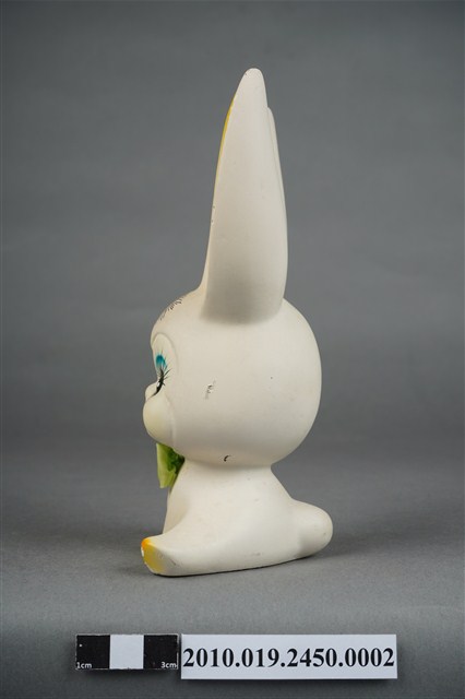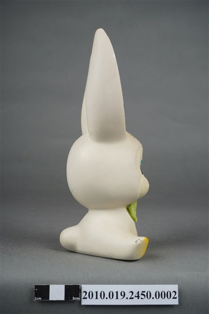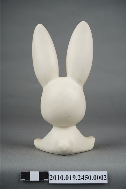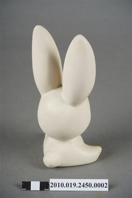 本物件為張眼瓷器兔擺飾玩偶,為瓷器材質一體成型,玩偶頭上有黑色太陽印記,大眼長睫毛,張嘴微笑,胸前並有綠色蝴蝶領結,雙手置於地上,雙腳打開席地而坐,耳朵、手掌與腳掌處有橘色點綴,然而玩偶之右耳有些許毀損,玩偶底座有張金色標籤上面寫有「建美藝品社」及公司電話與住址。