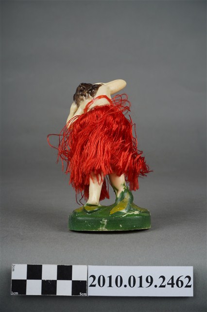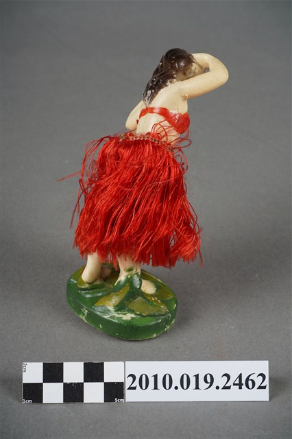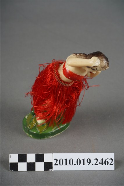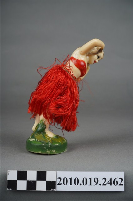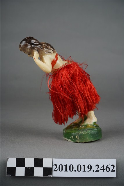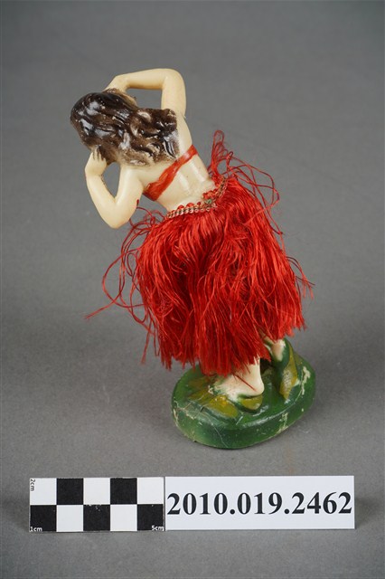 1.本物件為紅色草裙舞女孩玩偶,赤腳呈跳舞站立姿勢,其為棕髮黑眼,身著紅色抹胸與紅色草裙。2.夏威夷舞是以夏威夷手語或舞蹈用具,表達歌曲內容,主要表達關愛、感恩、尊敬,藉由舞蹈來抒發內心情感、釋放壓力、調節情緒、新生平衡等。