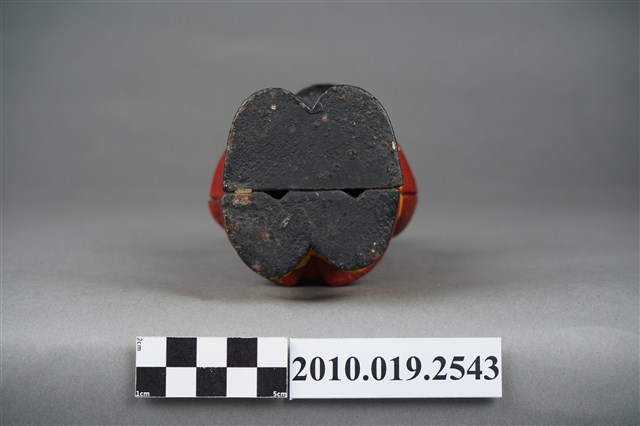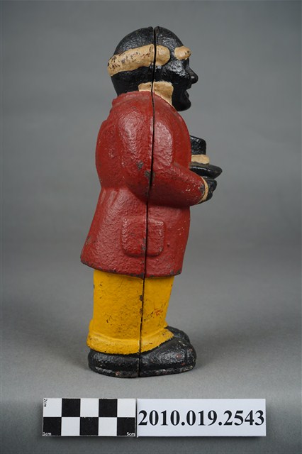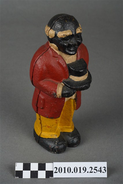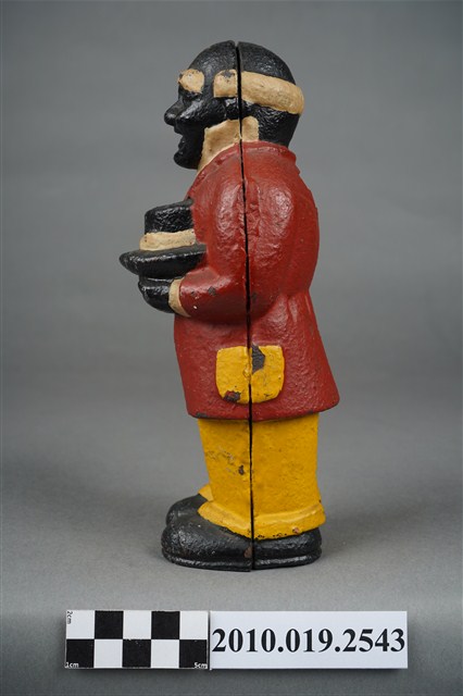 本物件為鐵鑄黑人造型存錢筒,整體為一黑人雙手捧著高頂帽,上身穿著紅色西裝白色內搭,下身穿黃色褲子搭配黑色鞋子。頭上有一投幣孔,側身有明顯正面與背面的接合縫。