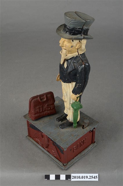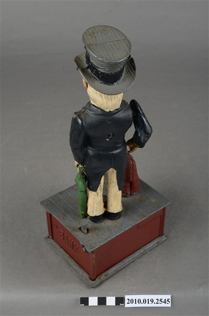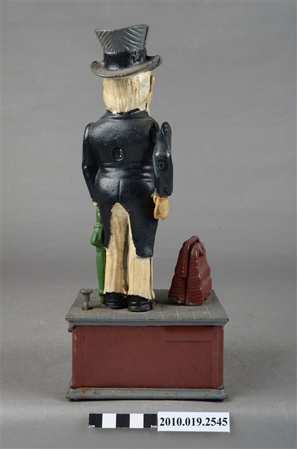 1.本物件為山姆大叔造型存錢筒,為頭戴高頂帽、身穿燕尾服、左手將綠色雨傘當作拐杖撐於地面的山姆大叔造型。其右手邊有一公事包,上方寫有「U.S」應是美國(United States)或者是山姆大叔(Uncle Sam)的縮寫。山姆大叔腳底下有一站臺,該站臺兩側寫著「BANK」,前側有美國的老鷹象徵圖案。