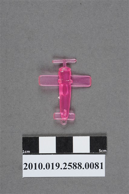 1.本件物為螺旋槳飛機造型尪仔仙,為粉紅色透明的塑膠材質。外型為螺旋槳飛機,機身可見一橢圓形機艙,有些微磨痕。機尾有一圓環,機腹於機翼及機尾各有一突起物,應為機輪。機身右側有射出痕。本系列尪仔仙多為相同塑膠模版,僅有顏色不同,或是同色同塑膠模版等形式。2.尪仔仙有小、中、大型之分,小型約長2公分,中型約長8-15公分左右,顏色以單色為主。長型則可長達30公分,以佛像、菩薩、神仙和唐三藏等造型為主,塗上金銀紅黃彩漆等亮色。1960、70年代的尪仔仙多以宗教、神話、布袋戲人物為造型。1980年代改以卡通、電玩、漫畫人物造型為主。常見玩法為兩人(或多人)各持一只尪仔仙,輪流用手指彈射,看誰的尪仔仙先疊在對方上面,便可贏得對方用來對戰的尪仔仙。