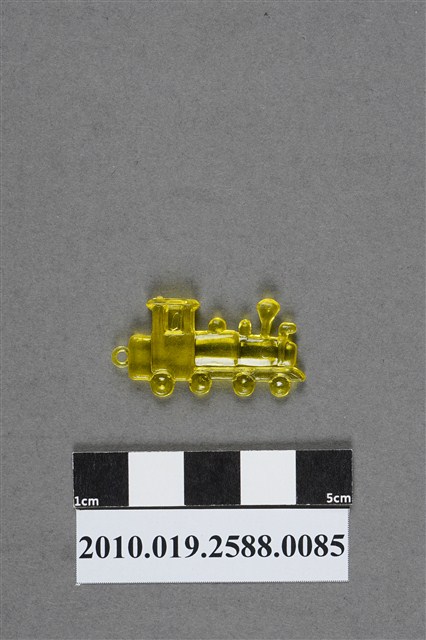 1.本件物為蒸機造型尪仔仙,為黃色透明的塑膠材質。外型為蒸氣火車頭,樣式似為臺鐵80號型蒸氣火車,車頭為車前燈、煙囪、儲氣室等構造,車體下方僅做出動輪,並無做出連結桿等細部結構,車頂有射出痕,車身有細微磨痕,車尾有一圓環。本系列尪仔仙多為相同塑膠模版,僅有顏色不同,或是同色同塑膠模版等形式。2.尪仔仙有小、中、大型之分,小型約長2公分,中型約長8-15公分左右,顏色以單色為主。長型則可長達30公分,以佛像、菩薩、神仙和唐三藏等造型為主,塗上金銀紅黃彩漆等亮色。1960、70年代的尪仔仙多以宗教、神話、布袋戲人物為造型。1980年代改以卡通、電玩、漫畫人物造型為主。常見玩法為兩人(或多人)各持一只尪仔仙,輪流用手指彈射,看誰的尪仔仙先疊在對方上面,便可贏得對方用來對戰的尪仔仙。