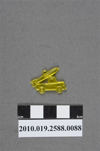 1.本件物為飛彈車造型尪仔仙,為黃色透明的塑膠材質。外型為一貨車,車斗上斜置一枚飛彈,飛彈上方有一圓環。背面後輪斜上方有一圓形痕跡及兩道明顯刮痕。本系列尪仔仙多為相同塑膠模版,僅有顏色不同,或是同色同塑膠模版等形式。2.尪仔仙有小、中、大型之分,小型約長2公分,中型約長8-15公分左右,顏色以單色為主。長型則可長達30公分,以佛像、菩薩、神仙和唐三藏等造型為主,塗上金銀紅黃彩漆等亮色。1960、70年代的尪仔仙多以宗教、神話、布袋戲人物為造型。1980年代改以卡通、電玩、漫畫人物造型為主。常見玩法為兩人(或多人)各持一只尪仔仙,輪流用手指彈射,看誰的尪仔仙先疊在對方上面,便可贏得對方用來對戰的尪仔仙。