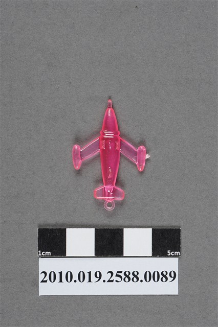 1.本件物為噴射機造型尪仔仙,為粉紅色透明的塑膠材質。外型為噴射機,左右兩側機翼尾端設有圓柱型噴射引擎,機身有磨痕,左側噴射引擎有射出痕。機尾有一圓環,機腹有三個突起物,應為機輪。本系列尪仔仙多為相同塑膠模版,僅有顏色不同,或是同色同塑膠模版等形式。2.尪仔仙有小、中、大型之分,小型約長2公分,中型約長8-15公分左右,顏色以單色為主。長型則可長達30公分,以佛像、菩薩、神仙和唐三藏等造型為主,塗上金銀紅黃彩漆等亮色。1960、70年代的尪仔仙多以宗教、神話、布袋戲人物為造型。1980年代改以卡通、電玩、漫畫人物造型為主。常見玩法為兩人(或多人)各持一只尪仔仙,輪流用手指彈射,看誰的尪仔仙先疊在對方上面,便可贏得對方用來對戰的尪仔仙。