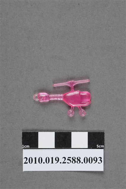 1.本件物為直升機造型尪仔仙,為粉紅色透明的塑膠材質。外型為直升機,機頂為螺旋槳,機身分為前方的駕駛艙及後方的機艙,駕駛艙為圓弧形。機尾有尾槳及一圓環,尾槳內有一圓球狀,機身下方有兩個機輪。正反機身均有一道明顯痕跡。本系列尪仔仙多為相同塑膠模版,僅有顏色不同,或是同色同塑膠模版等形式。2.尪仔仙有小、中、大型之分,小型約長2公分,中型約長8-15公分左右,顏色以單色為主。長型則可長達30公分,以佛像、菩薩、神仙和唐三藏等造型為主,塗上金銀紅黃彩漆等亮色。1960、70年代的尪仔仙多以宗教、神話、布袋戲人物為造型。1980年代改以卡通、電玩、漫畫人物造型為主。常見玩法為兩人(或多人)各持一只尪仔仙,輪流用手指彈射,看誰的尪仔仙先疊在對方上面,便可贏得對方用來對戰的尪仔仙。
