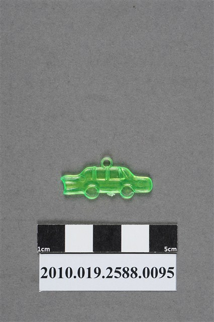 1.本件物為汽車造型尪仔仙,為綠色透明的塑膠材質。外型為汽車,車身有兩扇車窗,車頭為圓弧狀,車尾則呈現凹凸狀,車頭與近車尾處各有一圓形痕。車頂有一圓環,車底則有射出痕。本系列尪仔仙多為相同塑膠模版,僅有顏色不同,或是同色同塑膠模版等形式。2.尪仔仙有小、中、大型之分,小型約長2公分,中型約長8-15公分左右,顏色以單色為主。長型則可長達30公分,以佛像、菩薩、神仙和唐三藏等造型為主,塗上金銀紅黃彩漆等亮色。1960、70年代的尪仔仙多以宗教、神話、布袋戲人物為造型。1980年代改以卡通、電玩、漫畫人物造型為主。常見玩法為兩人(或多人)各持一只尪仔仙,輪流用手指彈射,看誰的尪仔仙先疊在對方上面,便可贏得對方用來對戰的尪仔仙。