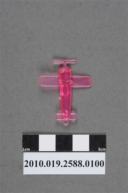 1.本件物為螺旋槳飛機造型尪仔仙,為粉紅色透明的塑膠材質。外型為螺旋槳飛機,機身可見一橢圓形機艙,有些微磨痕。機尾有一圓環,機腹於機翼及機尾各有一突起物,應為機輪。機身右側有射出痕。本系列尪仔仙多為相同塑膠模版,僅有顏色不同,或是同色同塑膠模版等形式。2.尪仔仙有小、中、大型之分,小型約長2公分,中型約長8-15公分左右,顏色以單色為主。長型則可長達30公分,以佛像、菩薩、神仙和唐三藏等造型為主,塗上金銀紅黃彩漆等亮色。1960、70年代的尪仔仙多以宗教、神話、布袋戲人物為造型。1980年代改以卡通、電玩、漫畫人物造型為主。常見玩法為兩人(或多人)各持一只尪仔仙,輪流用手指彈射,看誰的尪仔仙先疊在對方上面,便可贏得對方用來對戰的尪仔仙。