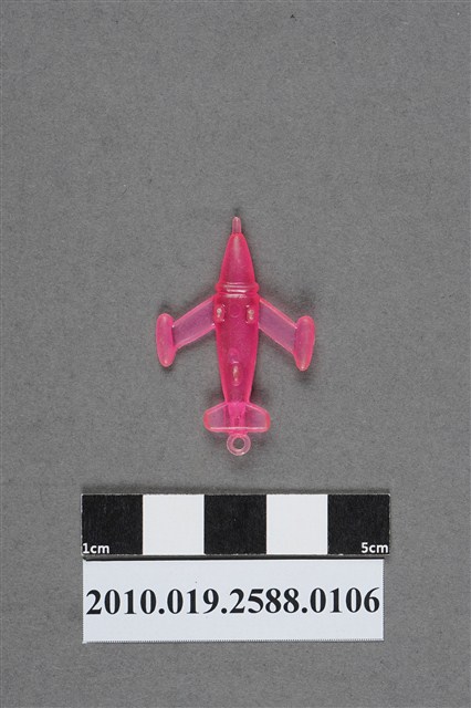 1.本件物為噴射機造型尪仔仙,為粉紅色透明的塑膠材質。外型為噴射機,左右兩側機翼尾端設有圓柱型噴射引擎,近機尾處有一氣泡,左側噴射引擎有射出痕。機尾有一圓環,機腹有三個突起物,應為機輪。本系列尪仔仙多為相同塑膠模版,僅有顏色不同,或是同色同塑膠模版等形式。2.尪仔仙有小、中、大型之分,小型約長2公分,中型約長8-15公分左右,顏色以單色為主。長型則可長達30公分,以佛像、菩薩、神仙和唐三藏等造型為主,塗上金銀紅黃彩漆等亮色。1960、70年代的尪仔仙多以宗教、神話、布袋戲人物為造型。1980年代改以卡通、電玩、漫畫人物造型為主。常見玩法為兩人(或多人)各持一只尪仔仙,輪流用手指彈射,看誰的尪仔仙先疊在對方上面,便可贏得對方用來對戰的尪仔仙。五○年代的尪仔仙,擁有豐富的色彩,小型尪仔仙約2公分,內容包羅萬象。