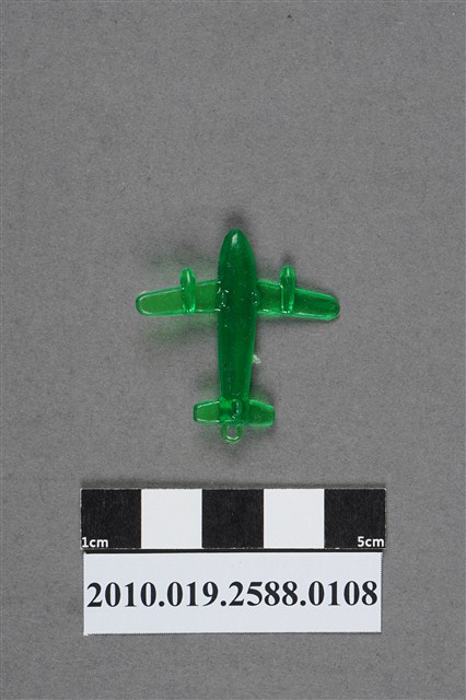 1.本件物為飛機造型尪仔仙,為綠色透明的塑膠材質。外型為飛機造型,機身為飛彈型,兩側機翼各有一發動機,機身左側有射出痕,設有尾翼及一圓環。機腹設有三個機輪。本系列尪仔仙多為相同塑膠模版,僅有顏色不同,或是同色同塑膠模版等形式。2.尪仔仙有小、中、大型之分,小型約長2公分,中型約長8-15公分左右,顏色以單色為主。長型則可長達30公分,以佛像、菩薩、神仙和唐三藏等造型為主,塗上金銀紅黃彩漆等亮色。1960、70年代的尪仔仙多以宗教、神話、布袋戲人物為造型。1980年代改以卡通、電玩、漫畫人物造型為主。常見玩法為兩人(或多人)各持一只尪仔仙,輪流用手指彈射,看誰的尪仔仙先疊在對方上面,便可贏得對方用來對戰的尪仔仙。五○年代的尪仔仙,擁有豐富的色彩,小型尪仔仙約2公分,內容包羅萬象。
