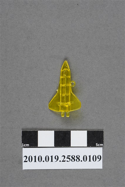 1.本件物為太空梭造型尪仔仙,為黃色透明的塑膠材質。外型為無火箭推進器的太空梭,機身切割出的六個圓柱體為軌道運行器,機尾則是發動機。機翼設於中後方,機身左側有一圓環,右側有射出痕。機腹設有三個機輪。本系列尪仔仙多為相同塑膠模版,僅有顏色不同,或是同色同塑膠模版等形式。2.尪仔仙有小、中、大型之分,小型約長2公分,中型約長8-15公分左右,顏色以單色為主。長型則可長達30公分,以佛像、菩薩、神仙和唐三藏等造型為主,塗上金銀紅黃彩漆等亮色。1960、70年代的尪仔仙多以宗教、神話、布袋戲人物為造型。1980年代改以卡通、電玩、漫畫人物造型為主。常見玩法為兩人(或多人)各持一只尪仔仙,輪流用手指彈射,看誰的尪仔仙先疊在對方上面,便可贏得對方用來對戰的尪仔仙。五○年代的尪仔仙,擁有豐富的色彩,小型尪仔仙約2公分,內容包羅萬象。