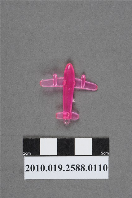 1.本件物為飛機造型尪仔仙,為粉紅色透明的塑膠材質。外型為飛機造型,機身為飛彈型,有一氣泡,兩側機翼各有一發動機,機身左側有射出痕,設有尾翼及一圓環。機腹設有三個機輪。本系列尪仔仙多為相同塑膠模版,僅有顏色不同,或是同色同塑膠模版等形式。2.尪仔仙有小、中、大型之分,小型約長2公分,中型約長8-15公分左右,顏色以單色為主。長型則可長達30公分,以佛像、菩薩、神仙和唐三藏等造型為主,塗上金銀紅黃彩漆等亮色。1960、70年代的尪仔仙多以宗教、神話、布袋戲人物為造型。1980年代改以卡通、電玩、漫畫人物造型為主。常見玩法為兩人(或多人)各持一只尪仔仙,輪流用手指彈射,看誰的尪仔仙先疊在對方上面,便可贏得對方用來對戰的尪仔仙。五○年代的尪仔仙,擁有豐富的色彩,小型尪仔仙約2公分,內容包羅萬象。