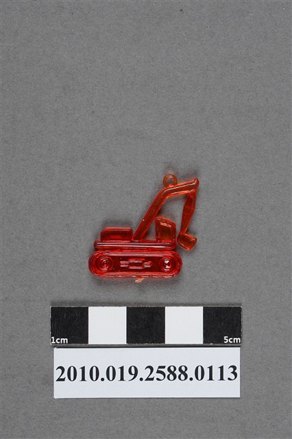 1.本件物為挖土機造型尪仔仙,為紅色透明的塑膠材質。外型為挖土機,機體有最下方的屨帶、中間的旋轉平台、駕駛座,及機械手臂和挖斗,機械手臂前臂及機械手臂後面的引擎各有一圓形痕,機械手臂後臂上有一圓環。履帶下方有射出痕。本系列尪仔仙多為相同塑膠模版,僅有顏色不同,或是同色同塑膠模版等形式。2.尪仔仙有小、中、大型之分,小型約長2公分,中型約長8-15公分左右,顏色以單色為主。長型則可長達30公分,以佛像、菩薩、神仙和唐三藏等造型為主,塗上金銀紅黃彩漆等亮色。1960、70年代的尪仔仙多以宗教、神話、布袋戲人物為造型。1980年代改以卡通、電玩、漫畫人物造型為主。常見玩法為兩人(或多人)各持一只尪仔仙,輪流用手指彈射,看誰的尪仔仙先疊在對方上面,便可贏得對方用來對戰的尪仔仙。五○年代的尪仔仙,擁有豐富的色彩,小型尪仔仙約2公分,內容包羅萬象。