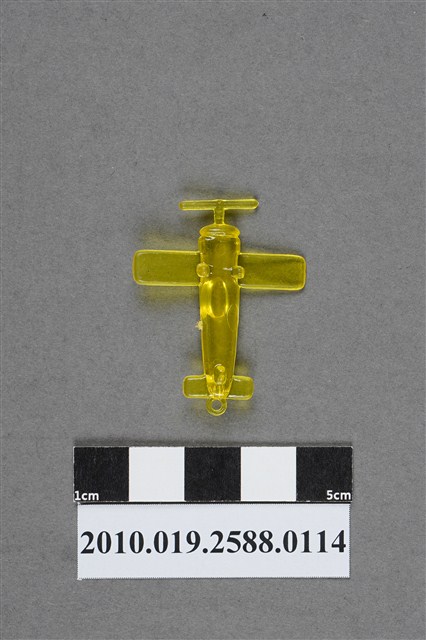 1.本件物為螺旋槳飛機造型尪仔仙,為黃色透明的塑膠材質。外型為螺旋槳飛機,機身可見一橢圓形機艙,右側有射出痕。機尾有一圓環,機腹於機翼及機尾各有一突起物,應為機輪。本系列尪仔仙多為相同塑膠模版,僅有顏色不同,或是同色同塑膠模版等形式。2.尪仔仙有小、中、大型之分,小型約長2公分,中型約長8-15公分左右,顏色以單色為主。長型則可長達30公分,以佛像、菩薩、神仙和唐三藏等造型為主,塗上金銀紅黃彩漆等亮色。1960、70年代的尪仔仙多以宗教、神話、布袋戲人物為造型。1980年代改以卡通、電玩、漫畫人物造型為主。常見玩法為兩人(或多人)各持一只尪仔仙,輪流用手指彈射,看誰的尪仔仙先疊在對方上面,便可贏得對方用來對戰的尪仔仙。五○年代的尪仔仙,擁有豐富的色彩,小型尪仔仙約2公分,內容包羅萬象。