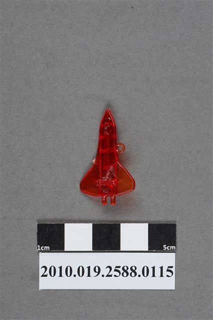 1.本件物為太空梭造型尪仔仙,為紅色透明的塑膠材質。外型為無火箭推進器的太空梭,機身切割出的六個圓柱體為軌道運行器,機尾則是發動機。機翼設於中後方,機身左側有一圓環,右側有射出痕,機尾有些微磨痕。機腹設有三個機輪,近機尾處有明顯磨痕。本系列尪仔仙多為相同塑膠模版,僅有顏色不同,或是同色同塑膠模版等形式。2.尪仔仙有小、中、大型之分,小型約長2公分,中型約長8-15公分左右,顏色以單色為主。長型則可長達30公分,以佛像、菩薩、神仙和唐三藏等造型為主,塗上金銀紅黃彩漆等亮色。1960、70年代的尪仔仙多以宗教、神話、布袋戲人物為造型。1980年代改以卡通、電玩、漫畫人物造型為主。常見玩法為兩人(或多人)各持一只尪仔仙,輪流用手指彈射,看誰的尪仔仙先疊在對方上面,便可贏得對方用來對戰的尪仔仙。五○年代的尪仔仙,擁有豐富的色彩,小型尪仔仙約2公分,內容包羅萬象。