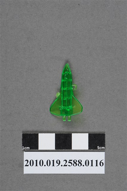 1.本件物為太空梭造型尪仔仙,為綠色透明的塑膠材質。外型為無火箭推進器的太空梭,機身切割出的六個圓柱體為軌道運行器,機尾則是發動機。機翼設於中後方,機身左側有一圓環,右側有射出痕。機腹設有三個機輪,近機尾處有明顯磨痕。本系列尪仔仙多為相同塑膠模版,僅有顏色不同,或是同色同塑膠模版等形式。2.尪仔仙有小、中、大型之分,小型約長2公分,中型約長8-15公分左右,顏色以單色為主。長型則可長達30公分,以佛像、菩薩、神仙和唐三藏等造型為主,塗上金銀紅黃彩漆等亮色。1960、70年代的尪仔仙多以宗教、神話、布袋戲人物為造型。1980年代改以卡通、電玩、漫畫人物造型為主。常見玩法為兩人(或多人)各持一只尪仔仙,輪流用手指彈射,看誰的尪仔仙先疊在對方上面,便可贏得對方用來對戰的尪仔仙。五○年代的尪仔仙,擁有豐富的色彩,小型尪仔仙約2公分,內容包羅萬象。