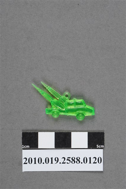 1.本件物為飛彈車造型尪仔仙,為綠色透明的塑膠材質。外型為一貨車,車斗上斜置兩枚彈頭向後的飛彈,上方飛彈上方有一圓環。貨車車頭與下方飛彈各有一圓形痕。車頂有疑似射出痕。本系列尪仔仙多為相同塑膠模版,僅有顏色不同,或是同色同塑膠模版等形式。2.尪仔仙有小、中、大型之分,小型約長2公分,中型約長8-15公分左右,顏色以單色為主。長型則可長達30公分,以佛像、菩薩、神仙和唐三藏等造型為主,塗上金銀紅黃彩漆等亮色。1960、70年代的尪仔仙多以宗教、神話、布袋戲人物為造型。1980年代改以卡通、電玩、漫畫人物造型為主。常見玩法為兩人(或多人)各持一只尪仔仙,輪流用手指彈射,看誰的尪仔仙先疊在對方上面,便可贏得對方用來對戰的尪仔仙。五○年代的尪仔仙,擁有豐富的色彩,小型尪仔仙約2公分,內容包羅萬象。