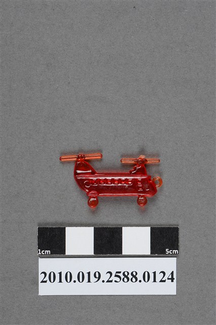 1.本件物為雙螺旋槳直升機造型尪仔仙,為紅色透明的塑膠材質。外型為雙螺旋槳直升機,機身上設有機艙門及窗戶,下方有兩個機輪,機鼻前有一圓環。前旋翼上方有射出痕。文物反面機身尾端有一圓形痕跡。本系列尪仔仙多為相同塑膠模版,僅有顏色不同,或是同色同塑膠模版等形式。2.尪仔仙有小、中、大型之分,小型約長2公分,中型約長8-15公分左右,顏色以單色為主。長型則可長達30公分,以佛像、菩薩、神仙和唐三藏等造型為主,塗上金銀紅黃彩漆等亮色。1960、70年代的尪仔仙多以宗教、神話、布袋戲人物為造型。1980年代改以卡通、電玩、漫畫人物造型為主。常見玩法為兩人(或多人)各持一只尪仔仙,輪流用手指彈射,看誰的尪仔仙先疊在對方上面,便可贏得對方用來對戰的尪仔仙。五○年代的尪仔仙,擁有豐富的色彩,小型尪仔仙約2公分,內容包羅萬象。