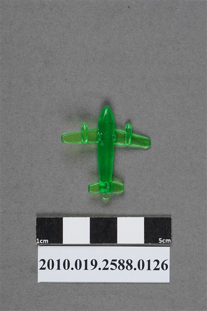 1.本件物為飛機造型尪仔仙,為綠色透明的塑膠材質。外型為飛機造型,機身為飛彈型,兩側機翼各有一發動機,機身左側有不明顯之射出痕,設有尾翼及一圓環。機腹設有三個機輪,兩前輪中間有一圓形痕。本系列尪仔仙多為相同塑膠模版,僅有顏色不同,或是同色同塑膠模版等形式。2.尪仔仙有小、中、大型之分,小型約長2公分,中型約長8-15公分左右,顏色以單色為主。長型則可長達30公分,以佛像、菩薩、神仙和唐三藏等造型為主,塗上金銀紅黃彩漆等亮色。1960、70年代的尪仔仙多以宗教、神話、布袋戲人物為造型。1980年代改以卡通、電玩、漫畫人物造型為主。常見玩法為兩人(或多人)各持一只尪仔仙,輪流用手指彈射,看誰的尪仔仙先疊在對方上面,便可贏得對方用來對戰的尪仔仙。五○年代的尪仔仙,擁有豐富的色彩,小型尪仔仙約2公分,內容包羅萬象。