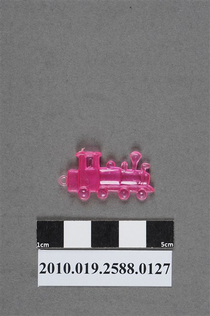 1.本件物為蒸機造型尪仔仙,為粉紅色透明的塑膠材質。外型為蒸氣火車頭,樣式似為臺鐵80號型蒸氣火車,車頭為車前燈、煙囪、儲氣室等構造,車體下方僅做出動輪,並無做出連結桿等細部結構,車尾有一圓環,駕駛座頂有射出痕。本系列尪仔仙多為相同塑膠模版,僅有顏色不同,或是同色同塑膠模版等形式。2.尪仔仙有小、中、大型之分,小型約長2公分,中型約長8-15公分左右,顏色以單色為主。長型則可長達30公分,以佛像、菩薩、神仙和唐三藏等造型為主,塗上金銀紅黃彩漆等亮色。1960、70年代的尪仔仙多以宗教、神話、布袋戲人物為造型。1980年代改以卡通、電玩、漫畫人物造型為主。常見玩法為兩人(或多人)各持一只尪仔仙,輪流用手指彈射,看誰的尪仔仙先疊在對方上面,便可贏得對方用來對戰的尪仔仙。五○年代的尪仔仙,擁有豐富的色彩,小型尪仔仙約2公分,內容包羅萬象。