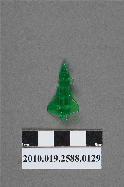 1.本件物為太空梭造型尪仔仙,為綠色透明的塑膠材質。外型為無火箭推進器的太空梭,機身切割出的六個圓柱體為軌道運行器,機尾則是發動機。機翼設於中後方,機身左側有一圓環,右側有射出痕。機腹設有三個機輪。文物兩面均有許多磨痕。本系列尪仔仙多為相同塑膠模版,僅有顏色不同,或是同色同塑膠模版等形式。2.尪仔仙有小、中、大型之分,小型約長2公分,中型約長8-15公分左右,顏色以單色為主。長型則可長達30公分,以佛像、菩薩、神仙和唐三藏等造型為主,塗上金銀紅黃彩漆等亮色。1960、70年代的尪仔仙多以宗教、神話、布袋戲人物為造型。1980年代改以卡通、電玩、漫畫人物造型為主。常見玩法為兩人(或多人)各持一只尪仔仙,輪流用手指彈射,看誰的尪仔仙先疊在對方上面,便可贏得對方用來對戰的尪仔仙。五○年代的尪仔仙,擁有豐富的色彩,小型尪仔仙約2公分,內容包羅萬象。