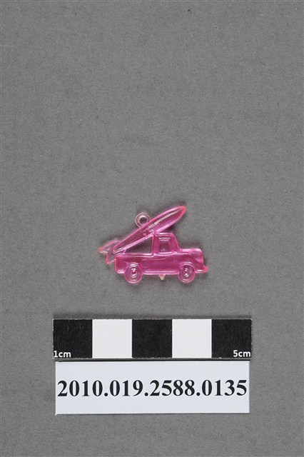 1.本件物為飛彈車造型尪仔仙,為粉紅色透明的塑膠材質。外型為一貨車,車斗上斜置一枚飛彈,飛彈上方有一圓環,彈身有三顆微小氣泡,車身下方有射出痕。背面後輪斜上方及飛彈彈身有一圓形痕跡及刮痕。本系列尪仔仙多為相同塑膠模版,僅有顏色不同,或是同色同塑膠模版等形式。2.尪仔仙有小、中、大型之分,小型約長2公分,中型約長8-15公分左右,顏色以單色為主。長型則可長達30公分,以佛像、菩薩、神仙和唐三藏等造型為主,塗上金銀紅黃彩漆等亮色。1960、70年代的尪仔仙多以宗教、神話、布袋戲人物為造型。1980年代改以卡通、電玩、漫畫人物造型為主。常見玩法為兩人(或多人)各持一只尪仔仙,輪流用手指彈射,看誰的尪仔仙先疊在對方上面,便可贏得對方用來對戰的尪仔仙。五○年代的尪仔仙,擁有豐富的色彩,小型尪仔仙約2公分,內容包羅萬象。