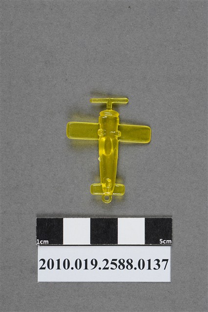 1.本件物為螺旋槳飛機造型尪仔仙,為黃色透明的塑膠材質。外型為螺旋槳飛機,機身可見一橢圓形機艙,右側有射出痕。機尾有一圓環,機腹於機翼及機尾各有一突起物,應為機輪。本系列尪仔仙多為相同塑膠模版,僅有顏色不同,或是同色同塑膠模版等形式。2.尪仔仙有小、中、大型之分,小型約長2公分,中型約長8-15公分左右,顏色以單色為主。長型則可長達30公分,以佛像、菩薩、神仙和唐三藏等造型為主,塗上金銀紅黃彩漆等亮色。1960、70年代的尪仔仙多以宗教、神話、布袋戲人物為造型。1980年代改以卡通、電玩、漫畫人物造型為主。常見玩法為兩人(或多人)各持一只尪仔仙,輪流用手指彈射,看誰的尪仔仙先疊在對方上面,便可贏得對方用來對戰的尪仔仙。五○年代的尪仔仙,擁有豐富的色彩,小型尪仔仙約2公分,內容包羅萬象。