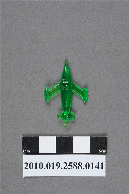 1.本件物為噴射機造型尪仔仙,為綠色透明的塑膠材質。外型為噴射機,左右兩側機翼尾端設有圓柱型噴射引擎,近機首處有一道刮痕,左側噴射引擎有射出痕。機尾有一圓環,機腹有三個突起物,應為機輪。本系列尪仔仙多為相同塑膠模版,僅有顏色不同,或是同色同塑膠模版等形式。2.尪仔仙有小、中、大型之分,小型約長2公分,中型約長8-15公分左右,顏色以單色為主。長型則可長達30公分,以佛像、菩薩、神仙和唐三藏等造型為主,塗上金銀紅黃彩漆等亮色。1960、70年代的尪仔仙多以宗教、神話、布袋戲人物為造型。1980年代改以卡通、電玩、漫畫人物造型為主。常見玩法為兩人(或多人)各持一只尪仔仙,輪流用手指彈射,看誰的尪仔仙先疊在對方上面,便可贏得對方用來對戰的尪仔仙。五○年代的尪仔仙,擁有豐富的色彩,小型尪仔仙約2公分,內容包羅萬象。