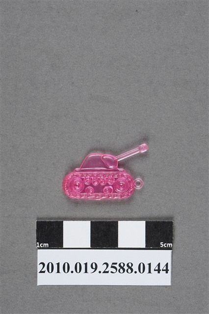 1.本件物為戰車造型尪仔仙,為粉紅色透明的塑膠材質。外型為戰車,炮塔左側為炮管,下方為履帶,履帶內有動輪與路輪,履帶左側有一圓環,下方有射出痕。本系列尪仔仙多為相同塑膠模版,僅有顏色不同,或是同色同塑膠模版等形式。2.尪仔仙有小、中、大型之分,小型約長2公分,中型約長8-15公分左右,顏色以單色為主。長型則可長達30公分,以佛像、菩薩、神仙和唐三藏等造型為主,塗上金銀紅黃彩漆等亮色。1960、70年代的尪仔仙多以宗教、神話、布袋戲人物為造型。1980年代改以卡通、電玩、漫畫人物造型為主。常見玩法為兩人(或多人)各持一只尪仔仙,輪流用手指彈射,看誰的尪仔仙先疊在對方上面,便可贏得對方用來對戰的尪仔仙。五○年代的尪仔仙,擁有豐富的色彩,小型尪仔仙約2公分,內容包羅萬象。