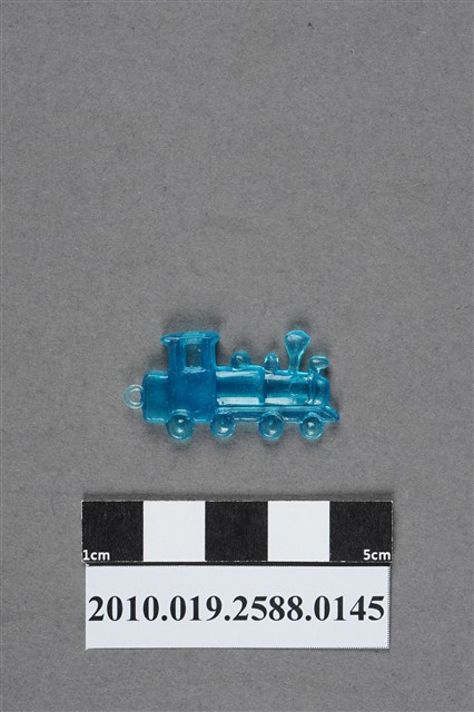 1.本件物為蒸機造型尪仔仙,為藍色透明的塑膠材質。外型為蒸氣火車頭,樣式似為臺鐵80號型蒸氣火車,車頭為車前燈、煙囪、儲氣室等構造,車體下方僅做出動輪,並無做出連結桿等細部結構,車尾有一圓環。反面煙囪下方有一圓形痕。本系列尪仔仙多為相同塑膠模版,僅有顏色不同,或是同色同塑膠模版等形式。2.尪仔仙有小、中、大型之分,小型約長2公分,中型約長8-15公分左右,顏色以單色為主。長型則可長達30公分,以佛像、菩薩、神仙和唐三藏等造型為主,塗上金銀紅黃彩漆等亮色。1960、70年代的尪仔仙多以宗教、神話、布袋戲人物為造型。1980年代改以卡通、電玩、漫畫人物造型為主。常見玩法為兩人(或多人)各持一只尪仔仙,輪流用手指彈射,看誰的尪仔仙先疊在對方上面,便可贏得對方用來對戰的尪仔仙。五○年代的尪仔仙,擁有豐富的色彩,小型尪仔仙約2公分,內容包羅萬象。