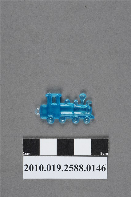 1.本件物為蒸機造型尪仔仙,為藍色透明的塑膠材質。外型為蒸氣火車頭,樣式似為臺鐵80號型蒸氣火車,車頭為車前燈、煙囪、儲氣室等構造,車體下方僅做出動輪,並無做出連結桿等細部結構,車尾有一圓環,駕駛座頂有一射出痕。本系列尪仔仙多為相同塑膠模版,僅有顏色不同,或是同色同塑膠模版等形式。2.尪仔仙有小、中、大型之分,小型約長2公分,中型約長8-15公分左右,顏色以單色為主。長型則可長達30公分,以佛像、菩薩、神仙和唐三藏等造型為主,塗上金銀紅黃彩漆等亮色。1960、70年代的尪仔仙多以宗教、神話、布袋戲人物為造型。1980年代改以卡通、電玩、漫畫人物造型為主。常見玩法為兩人(或多人)各持一只尪仔仙,輪流用手指彈射,看誰的尪仔仙先疊在對方上面,便可贏得對方用來對戰的尪仔仙。五○年代的尪仔仙,擁有豐富的色彩,小型尪仔仙約2公分,內容包羅萬象。