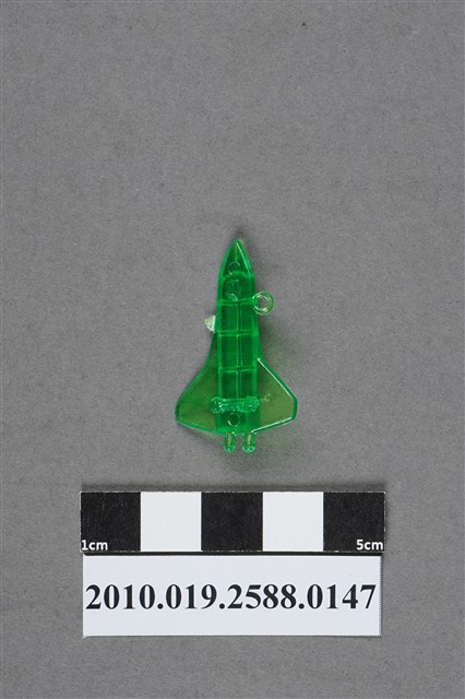 1.本件物為太空梭造型尪仔仙,為綠色透明的塑膠材質。外型為無火箭推進器的太空梭,機身切割出的六個圓柱體為軌道運行器,機尾則是發動機。機翼設於中後方,機身左側有一圓環,右側有射出痕。機腹設有三個機輪,機首及機尾各有一圓形痕。本系列尪仔仙多為相同塑膠模版,僅有顏色不同,或是同色同塑膠模版等形式。2.尪仔仙有小、中、大型之分,小型約長2公分,中型約長8-15公分左右,顏色以單色為主。長型則可長達30公分,以佛像、菩薩、神仙和唐三藏等造型為主,塗上金銀紅黃彩漆等亮色。1960、70年代的尪仔仙多以宗教、神話、布袋戲人物為造型。1980年代改以卡通、電玩、漫畫人物造型為主。常見玩法為兩人(或多人)各持一只尪仔仙,輪流用手指彈射,看誰的尪仔仙先疊在對方上面,便可贏得對方用來對戰的尪仔仙。五○年代的尪仔仙,擁有豐富的色彩,小型尪仔仙約2公分,內容包羅萬象。
