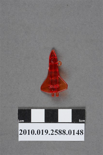 1.本件物為太空梭造型尪仔仙,為紅色透明的塑膠材質。外型為無火箭推進器的太空梭,機身切割出的六個圓柱體為軌道運行器,機尾則是發動機。機翼設於中後方,近翼端有明顯磨痕。機身左側有一圓環,右側有射出痕。機腹設有三個機輪,機首及機尾各有一圓形痕。本系列尪仔仙多為相同塑膠模版,僅有顏色不同,或是同色同塑膠模版等形式。2.尪仔仙有小、中、大型之分,小型約長2公分,中型約長8-15公分左右,顏色以單色為主。長型則可長達30公分,以佛像、菩薩、神仙和唐三藏等造型為主,塗上金銀紅黃彩漆等亮色。1960、70年代的尪仔仙多以宗教、神話、布袋戲人物為造型。1980年代改以卡通、電玩、漫畫人物造型為主。常見玩法為兩人(或多人)各持一只尪仔仙,輪流用手指彈射,看誰的尪仔仙先疊在對方上面,便可贏得對方用來對戰的尪仔仙。五○年代的尪仔仙,擁有豐富的色彩,小型尪仔仙約2公分,內容包羅萬象。