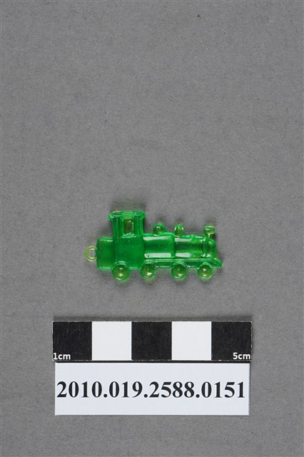 1.本件物為蒸機造型尪仔仙,為綠色透明的塑膠材質。外型為蒸氣火車頭,樣式似為臺鐵80號型蒸氣火車,車頭為車前燈、煙囪、儲氣室等構造,車體下方僅做出動輪,並無做出連結桿等細部結構,車尾有一圓環,駕駛座頂有一射出痕。文物雙面均有細微磨痕。本系列尪仔仙多為相同塑膠模版,僅有顏色不同,或是同色同塑膠模版等形式。2.尪仔仙有小、中、大型之分,小型約長2公分,中型約長8-15公分左右,顏色以單色為主。長型則可長達30公分,以佛像、菩薩、神仙和唐三藏等造型為主,塗上金銀紅黃彩漆等亮色。1960、70年代的尪仔仙多以宗教、神話、布袋戲人物為造型。1980年代改以卡通、電玩、漫畫人物造型為主。常見玩法為兩人(或多人)各持一只尪仔仙,輪流用手指彈射,看誰的尪仔仙先疊在對方上面,便可贏得對方用來對戰的尪仔仙。五○年代的尪仔仙,擁有豐富的色彩,小型尪仔仙約2公分,內容包羅萬象。