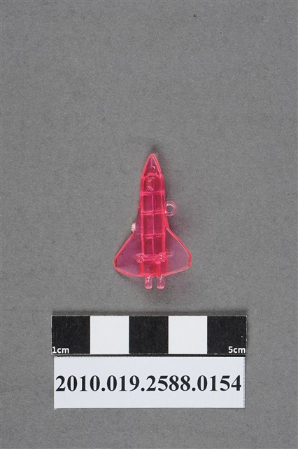 1.本件物為太空梭造型尪仔仙,為粉紅色透明的塑膠材質。外型為無火箭推進器的太空梭,機身切割出的六個圓柱體為軌道運行器,機尾則是發動機。機翼設於中後方,機身左側有一圓環,右側有射出痕。機腹設有三個機輪,機首及機尾各有一圓形痕。本系列尪仔仙多為相同塑膠模版,僅有顏色不同,或是同色同塑膠模版等形式。2.尪仔仙有小、中、大型之分,小型約長2公分,中型約長8-15公分左右,顏色以單色為主。長型則可長達30公分,以佛像、菩薩、神仙和唐三藏等造型為主,塗上金銀紅黃彩漆等亮色。1960、70年代的尪仔仙多以宗教、神話、布袋戲人物為造型。1980年代改以卡通、電玩、漫畫人物造型為主。常見玩法為兩人(或多人)各持一只尪仔仙,輪流用手指彈射,看誰的尪仔仙先疊在對方上面,便可贏得對方用來對戰的尪仔仙。五○年代的尪仔仙,擁有豐富的色彩,小型尪仔仙約2公分,內容包羅萬象。