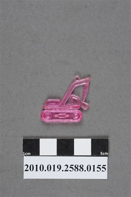 1.本件物為挖土機造型尪仔仙,為粉紅色透明的塑膠材質。外型為挖土機,機體有最下方的屨帶、中間的旋轉平台、駕駛座,及機械手臂和挖斗,機械手臂前臂及機械手臂後面的引擎各有一圓形痕,機械手臂後臂上有一圓環。履帶下方有射出痕。本系列尪仔仙多為相同塑膠模版,僅有顏色不同,或是同色同塑膠模版等形式。2.尪仔仙有小、中、大型之分,小型約長2公分,中型約長8-15公分左右,顏色以單色為主。長型則可長達30公分,以佛像、菩薩、神仙和唐三藏等造型為主,塗上金銀紅黃彩漆等亮色。1960、70年代的尪仔仙多以宗教、神話、布袋戲人物為造型。1980年代改以卡通、電玩、漫畫人物造型為主。常見玩法為兩人(或多人)各持一只尪仔仙,輪流用手指彈射,看誰的尪仔仙先疊在對方上面,便可贏得對方用來對戰的尪仔仙。五○年代的尪仔仙,擁有豐富的色彩,小型尪仔仙約2公分,內容包羅萬象。