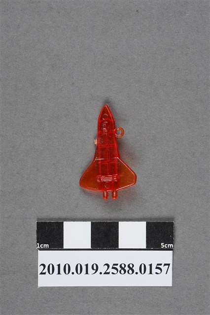 1.本件物為太空梭造型尪仔仙,為紅色透明的塑膠材質。外型為無火箭推進器的太空梭,機身切割出的六個圓柱體為軌道運行器,機尾則是發動機。機翼設於中後方,機身左側有一圓環,右側有射出痕。機腹設有三個機輪,機首及機尾各有一圓形痕。本文物雙面均有磨損痕跡。本系列尪仔仙多為相同塑膠模版,僅有顏色不同,或是同色同塑膠模版等形式。2.尪仔仙有小、中、大型之分,小型約長2公分,中型約長8-15公分左右,顏色以單色為主。長型則可長達30公分,以佛像、菩薩、神仙和唐三藏等造型為主,塗上金銀紅黃彩漆等亮色。1960、70年代的尪仔仙多以宗教、神話、布袋戲人物為造型。1980年代改以卡通、電玩、漫畫人物造型為主。常見玩法為兩人(或多人)各持一只尪仔仙,輪流用手指彈射,看誰的尪仔仙先疊在對方上面,便可贏得對方用來對戰的尪仔仙。五○年代的尪仔仙,擁有豐富的色彩,小型尪仔仙約2公分,內容包羅萬象。