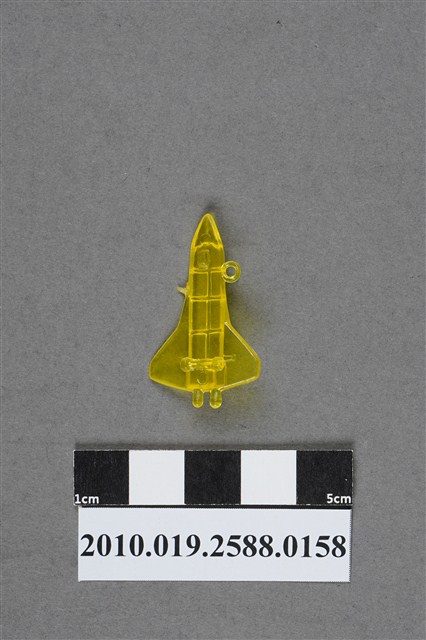 1.本件物為太空梭造型尪仔仙,為黃色透明的塑膠材質。外型為無火箭推進器的太空梭,機身切割出的六個圓柱體為軌道運行器,機尾則是發動機。機翼設於中後方,機身左側有一圓環,右側有射出痕。機腹設有三個機輪,機首及機尾各有一圓形痕。本系列尪仔仙多為相同塑膠模版,僅有顏色不同,或是同色同塑膠模版等形式。2.尪仔仙有小、中、大型之分,小型約長2公分,中型約長8-15公分左右,顏色以單色為主。長型則可長達30公分,以佛像、菩薩、神仙和唐三藏等造型為主,塗上金銀紅黃彩漆等亮色。1960、70年代的尪仔仙多以宗教、神話、布袋戲人物為造型。1980年代改以卡通、電玩、漫畫人物造型為主。常見玩法為兩人(或多人)各持一只尪仔仙,輪流用手指彈射,看誰的尪仔仙先疊在對方上面,便可贏得對方用來對戰的尪仔仙。五○年代的尪仔仙,擁有豐富的色彩,小型尪仔仙約2公分,內容包羅萬象。